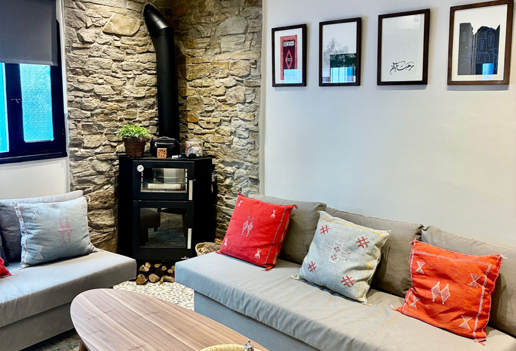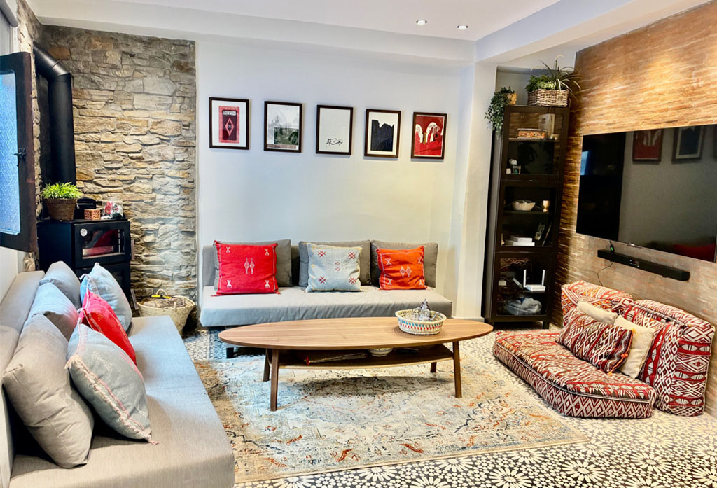 El amplio salón cuenta con una distribución abierta y luminosa, equipado con dos cómodos sofás camas, Smart TV 80”, equipo de música, aire Acondicionado, iluminación regulable y chimenea, además de ventanales con vistas a la medina.