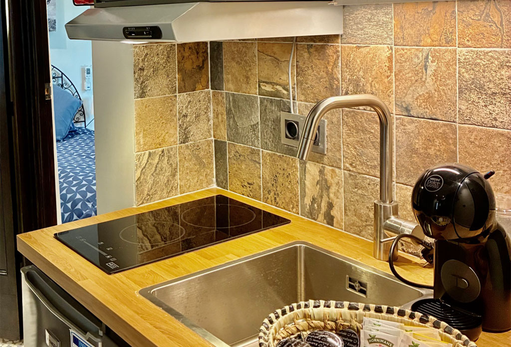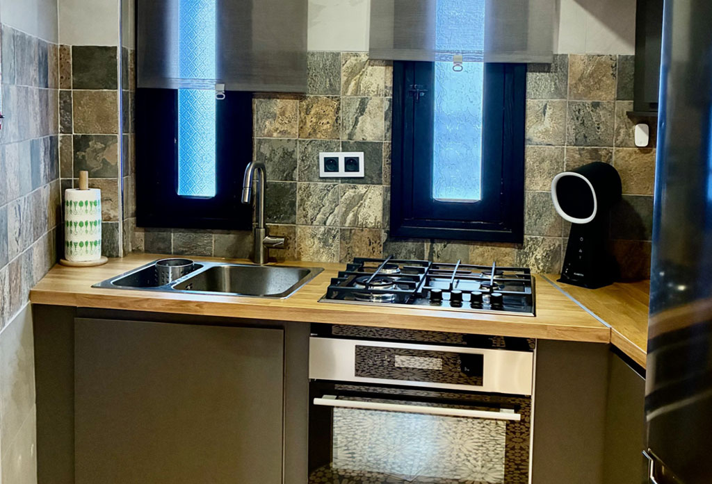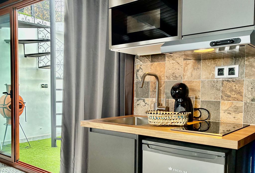 El módulo de cocina está completamente equipado con modernos electrodomésticos y menaje, un baño con ducha y acabados de primera calidad, y el dormitorio ofrece una amplia cama de matrimonio, armario con caja fuerte, smart TV, wifi, aire acondicionado y una atmósfera serena ideal para el descanso.