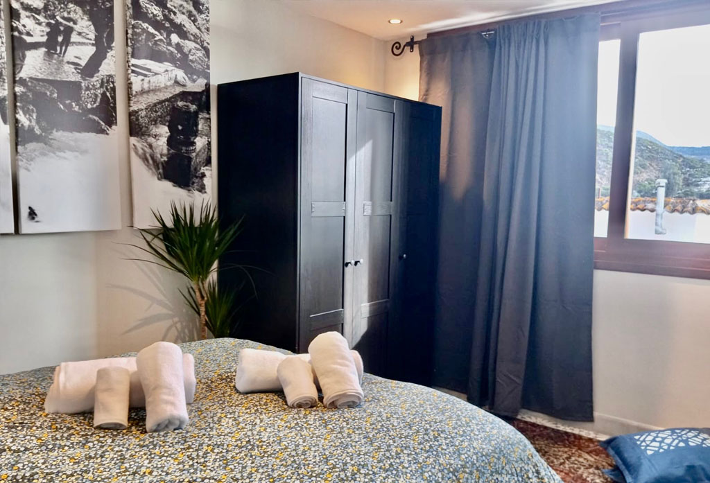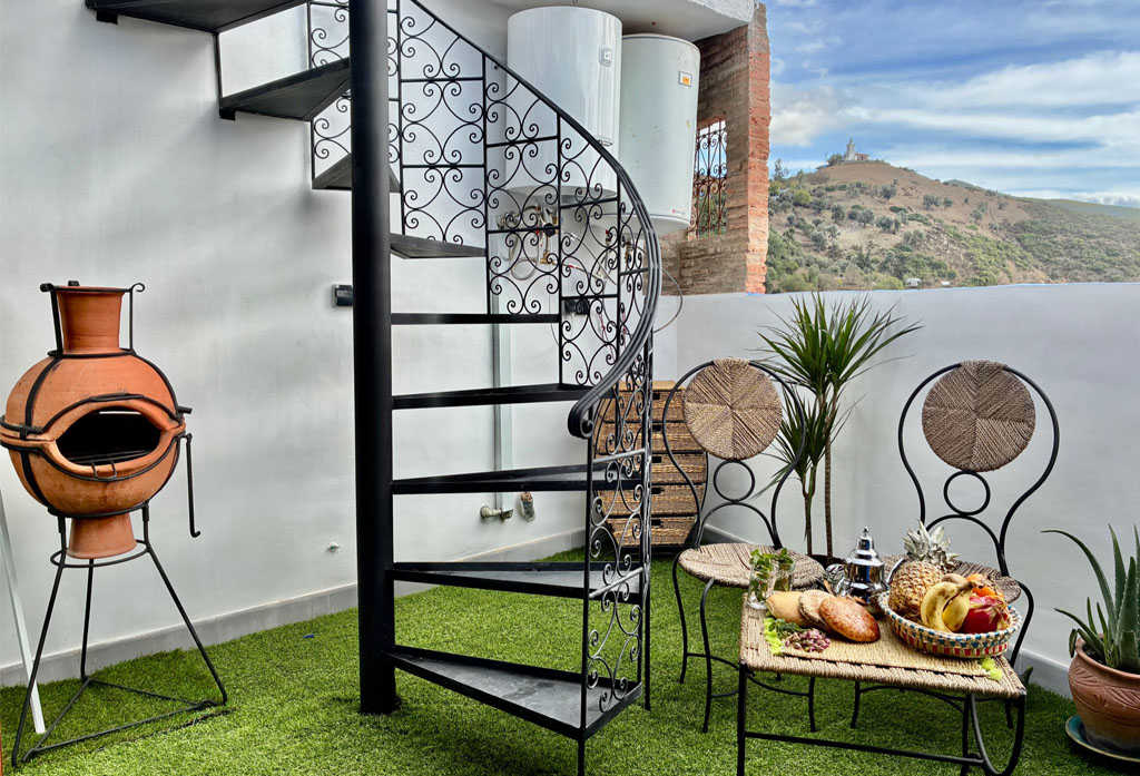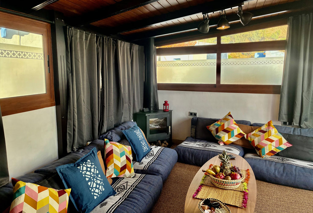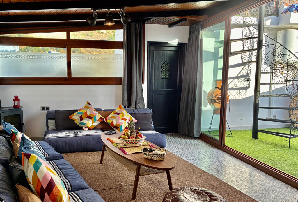 Desde su gran salón con chimenea y smart TV se accede directamente a una espectacular terraza-solárium con hamacas y vistas panorámicas tanto a las montañas del Rif como al mágico pueblo.