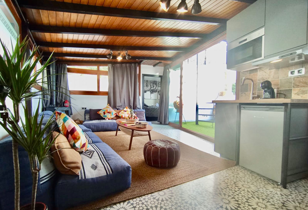 Dispone de un salón cómodo con módulo de cocina completo incluido todo menaje de cocina, sofá y smart TV, además de aire Acondicionado y Wi-Fi.